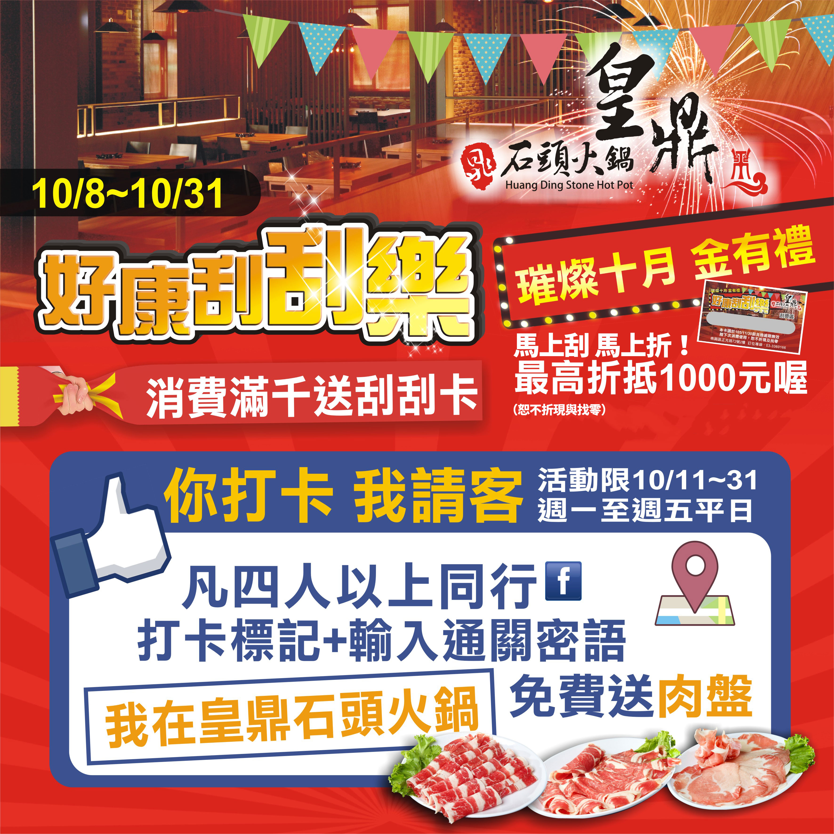 2016年10月8日~31日好禮雙重送! 第一重:消費滿千送刮刮卡!馬上刮,馬上折!(最高折抵1000) 第二重:四人同行,打卡送肉盤! Related posts皇鼎最新外帶菜單25 1 月, 20172017新年同樂會3 1 月, 2017寒冬新品上市2 12 月, 2016VIP卡認購中31 10 月, 2016壽星請吃飯31 10 月, 2016新店開幕最新折扣10 9 月, 2016
